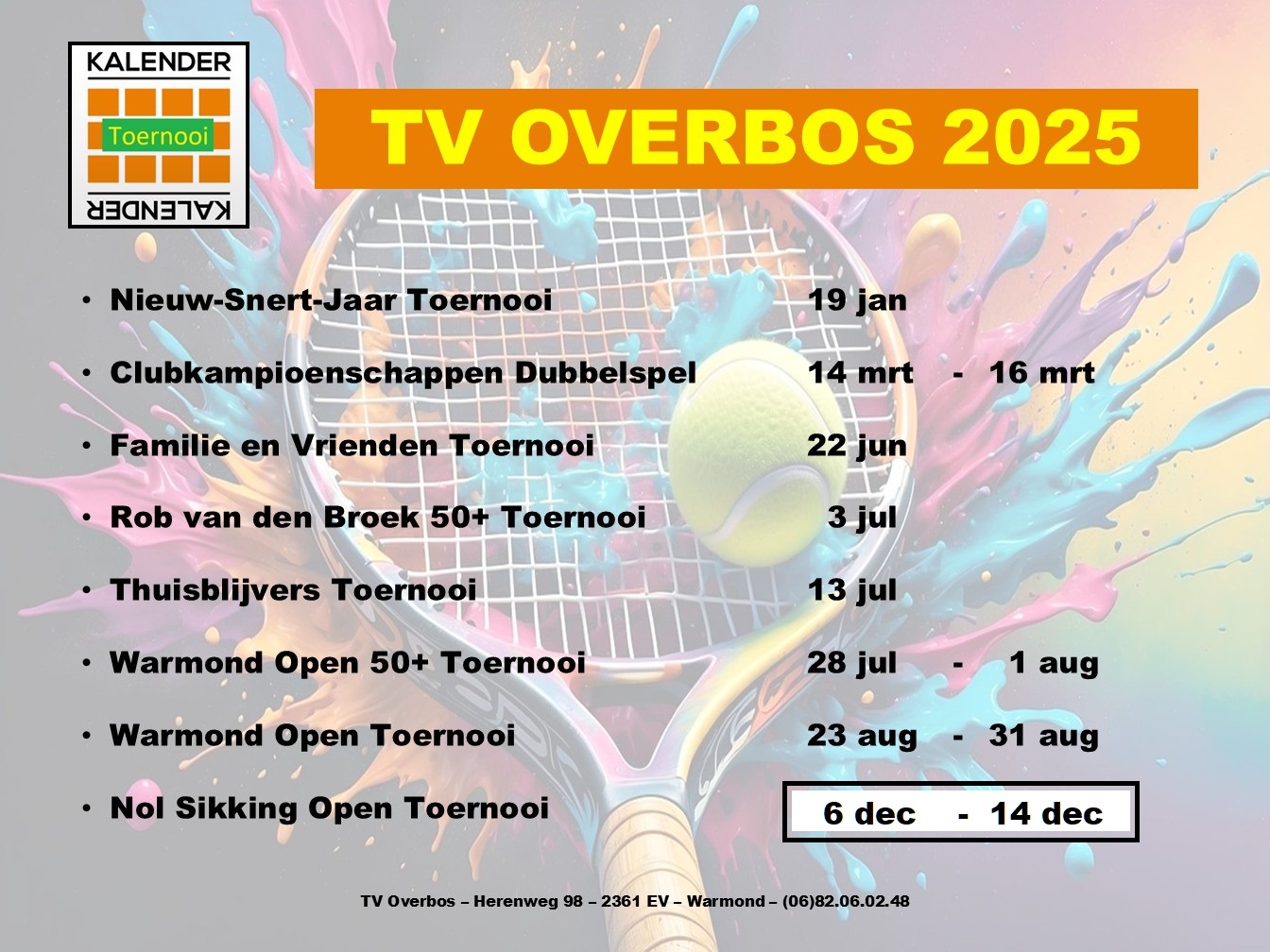 Het Nol Sikking Open toernooi, wordt gespeeld van zaterdag 6 december t/m zondag 14 december. De inschrijvingen staan open op : https://mijnknltb.toernooi.nl/