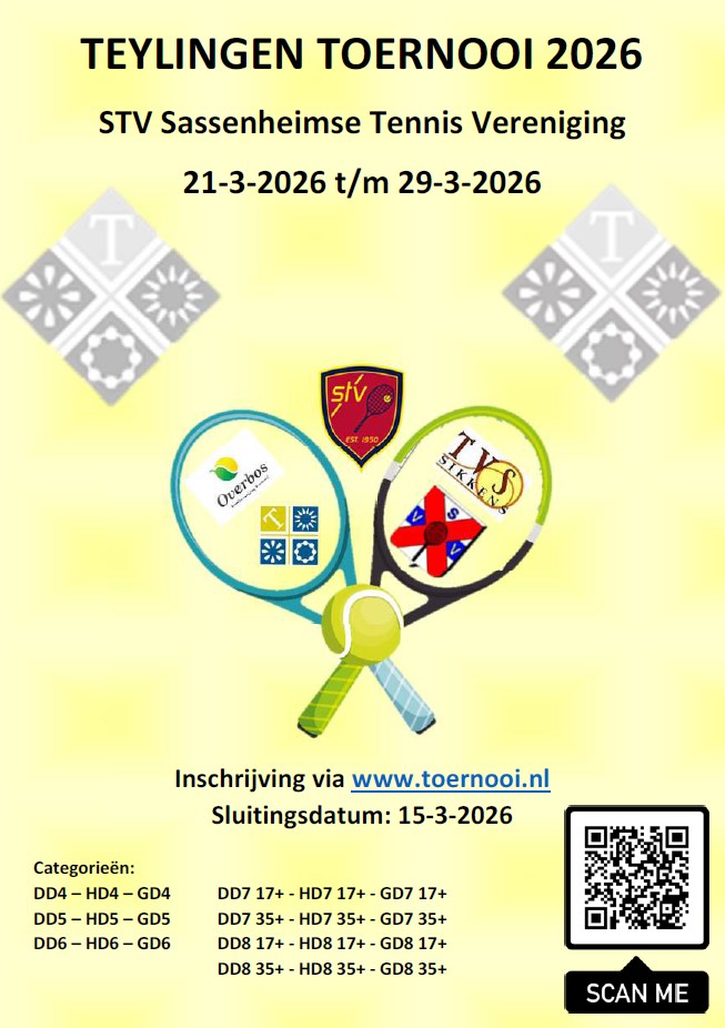 Het gemeenschappelijke Teylingen Open toernooi van TV Overbos, TVS, SVV en STV, wordt dit keer georganiseerd door STV van 21-3 t/m 29-3. De inschrijvingen staan open voor alle leden van de 4 verenigingen.